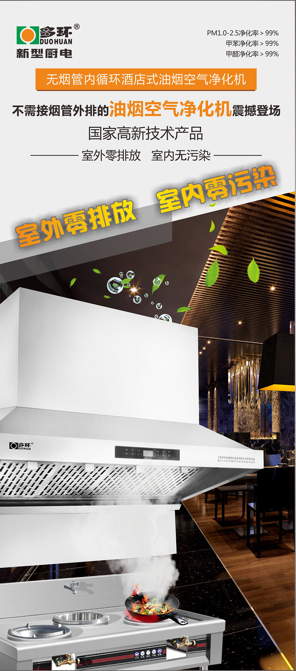 多環凈化設備公司研發生產的無管式內循環油煙凈化機是不用煙管對外排放的油煙凈化設備,采用吸排凈化一體機的形式將烹飪產生的油脂、煙顆粒物及有害氣體(醛、苯、VOCs等)、異味(辣、臭、酸味等)和有害細菌在室內進行凈化處理的廚電產品。(*數據來源于上海市環境保護產品質量監督檢驗總站出具的《檢測報告》報告編號:2016|20-35-885523/2016|20-35-885524)